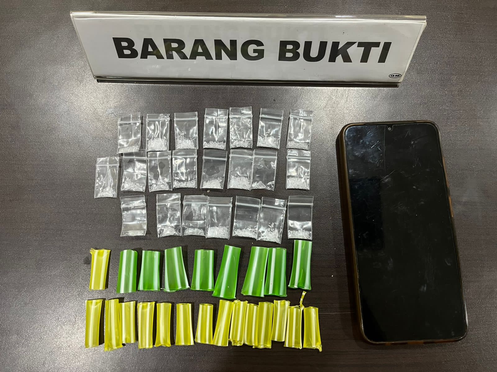 Dalam penggeledahan di tempat kejadian perkara (TKP), petugas menemukan sejumlah barang bukti yang memperkuat dugaan keterlibatan tersangka dalam peredaran sabu.