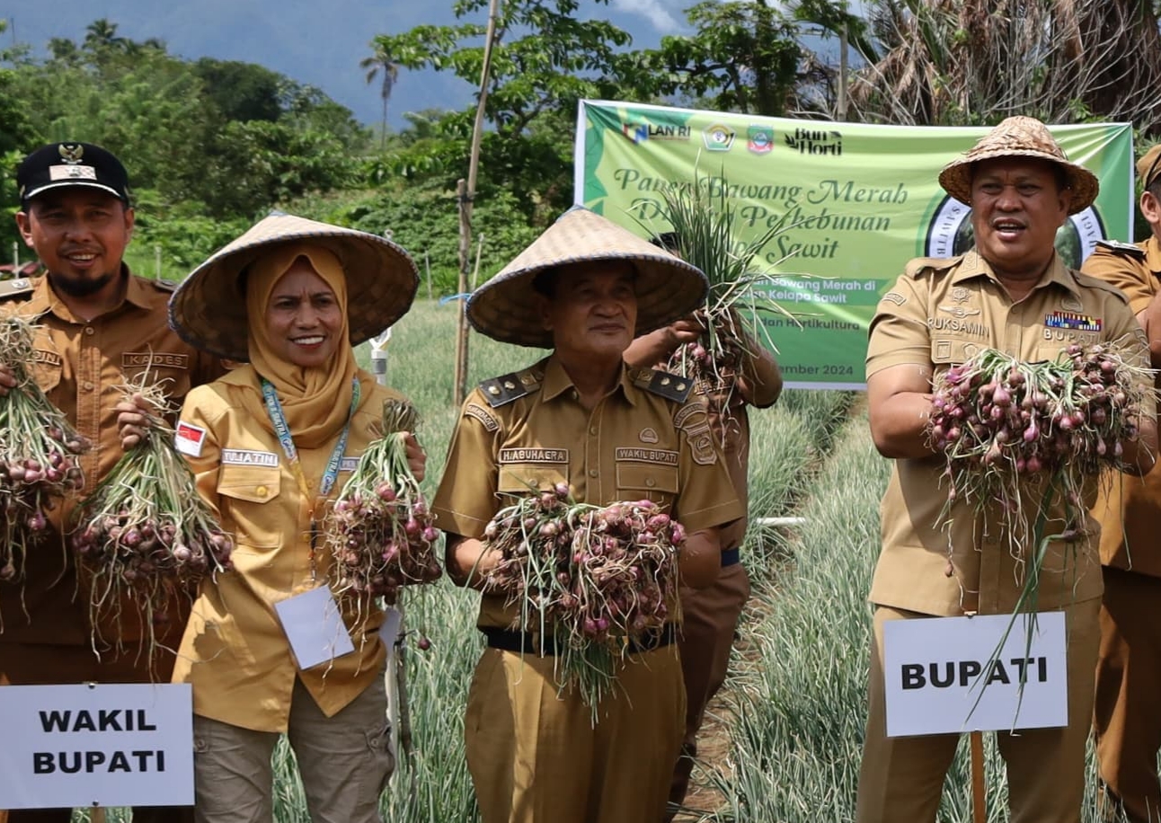 Ia menjelaskan, penanaman dilakukan dengan pola integrasi di lahan perkebunan sawit, sehingga selain meningkatkan pendapatan dari sawit, petani juga mendapatkan tambahan dari bawang merah.