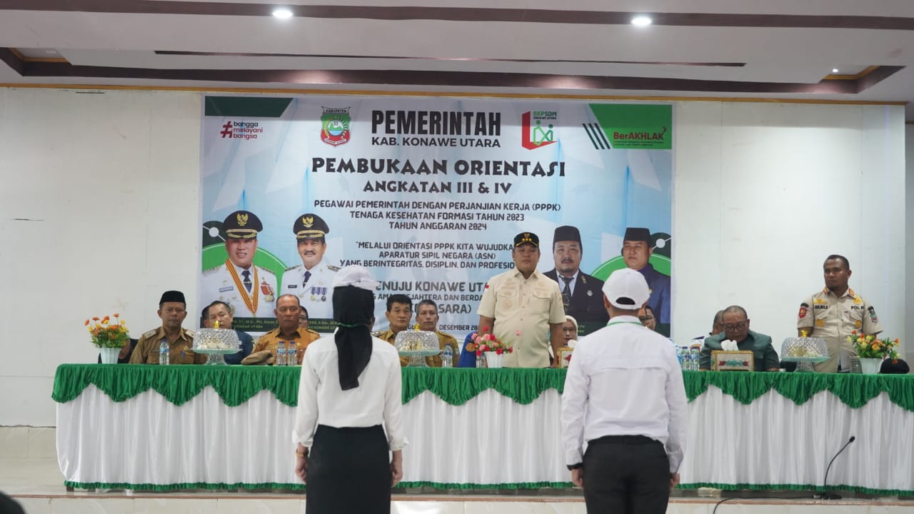 Anoapos.com | Konut – Bupati Konawe Utara (Konut) Provinsi Sulawesi Tenggara (Sultra) Dr. Ir. H. Ruksamin, ST. M.Si, IPU, ASEAN Eng, membuka kegiatan orientasi Pegawai Pemerintah dengan Perjanjian Kerja (PPPK) tenaga kesehatan angkatan III dan IV formasi tahun 2023 tahun anggaran 2024.