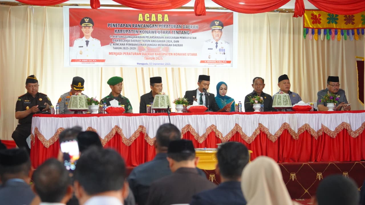 Anoapos.com | Konut – Bupati Konawe Utara (Konut) Provinsi Sulawesi Tenggara (Sultra) , H. Ikbar, S.H., MH telah resmi menetapkan Rancangan Peraturan Daerah (Ranperda) menjadi Peraturan Daerah (Perda) pada Rabu (03/09/2025). Dua regulasi penting tersebut adalah laporan pertanggungjawaban pelaksanaan APBD Tahun Anggaran 2024 serta Rencana Pembangunan Jangka Menengah Daerah (RPJMD) Kabupaten Konawe Utara Tahun 2025 – 2029.