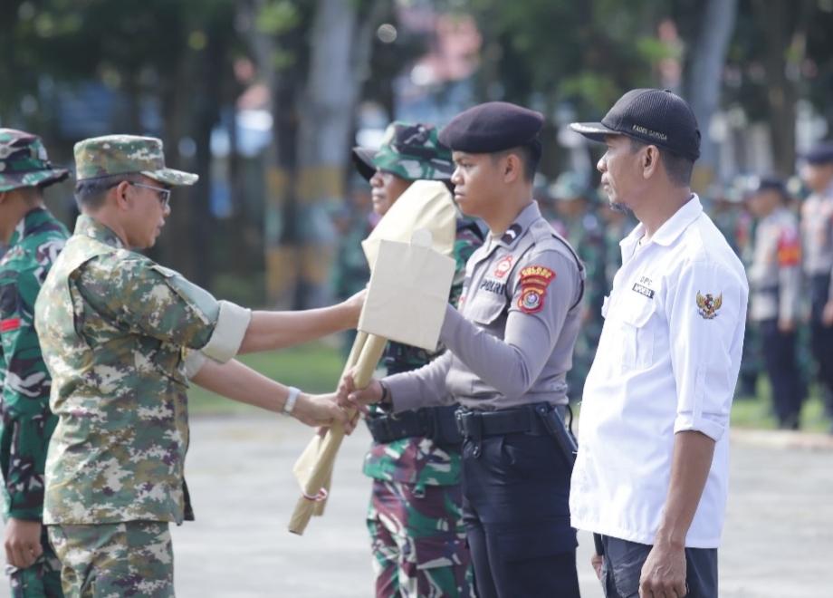Sebagai penanda dimulainya program TMMD tersebut, Bupati Yusran secara simbolis menyematkan alat kerja kepada perwakilan personel TNI dan Polri.
