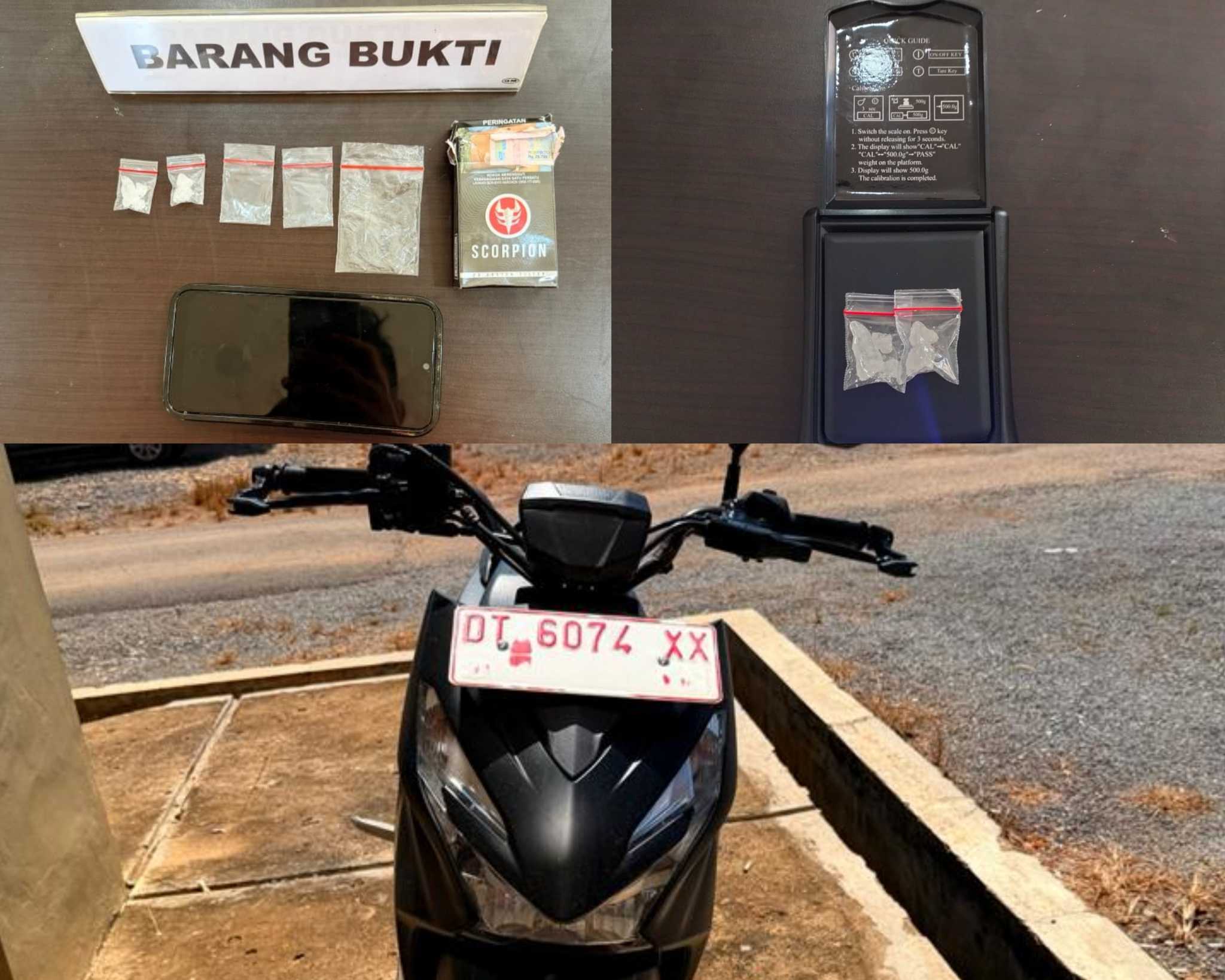 2 Sachet plastik bening berisi kristal putih diduga Narkotika jenis Sabu dengan berat bruto 1,73 gram. 3 Sachet plastik kosong yang diduga akan digunakan untuk memecah paket sabu.