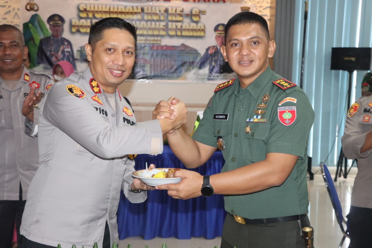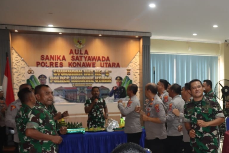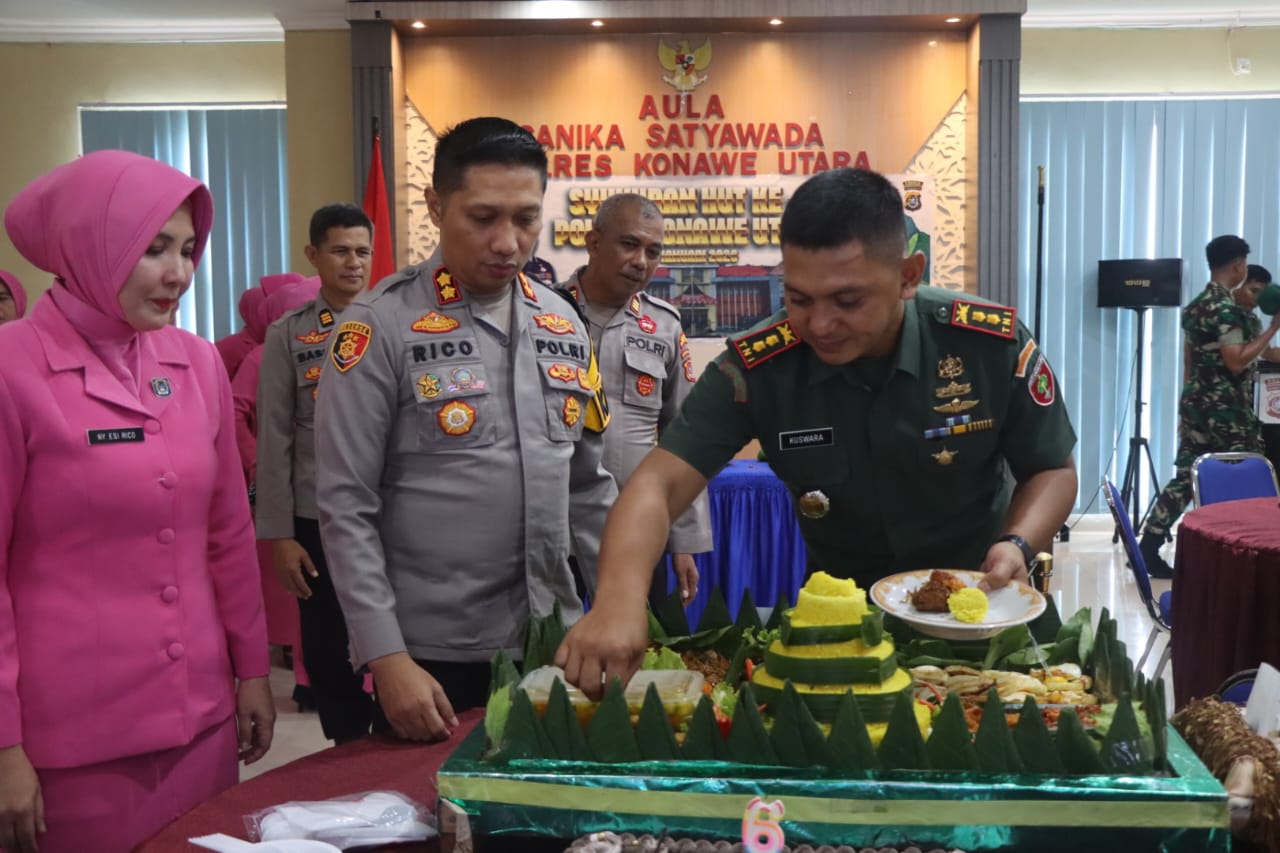 Puluhan prajurit TNI datang dan membawa nasi tumpeng serta kue bertuliskan Dirgahayu ke-6 Kepolisian Resor (Polres) Konawe Utara.