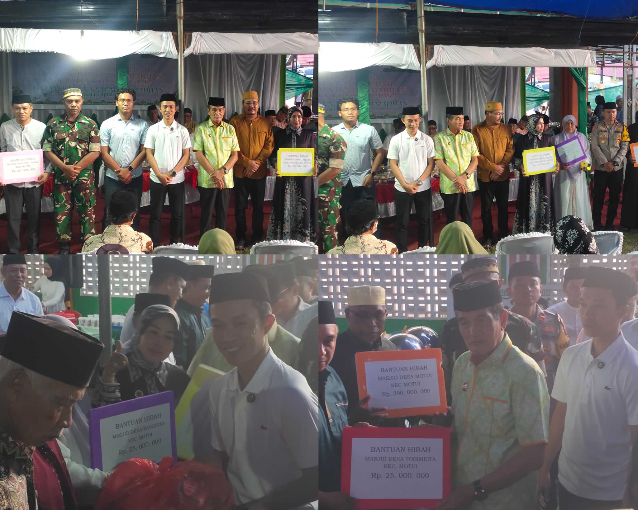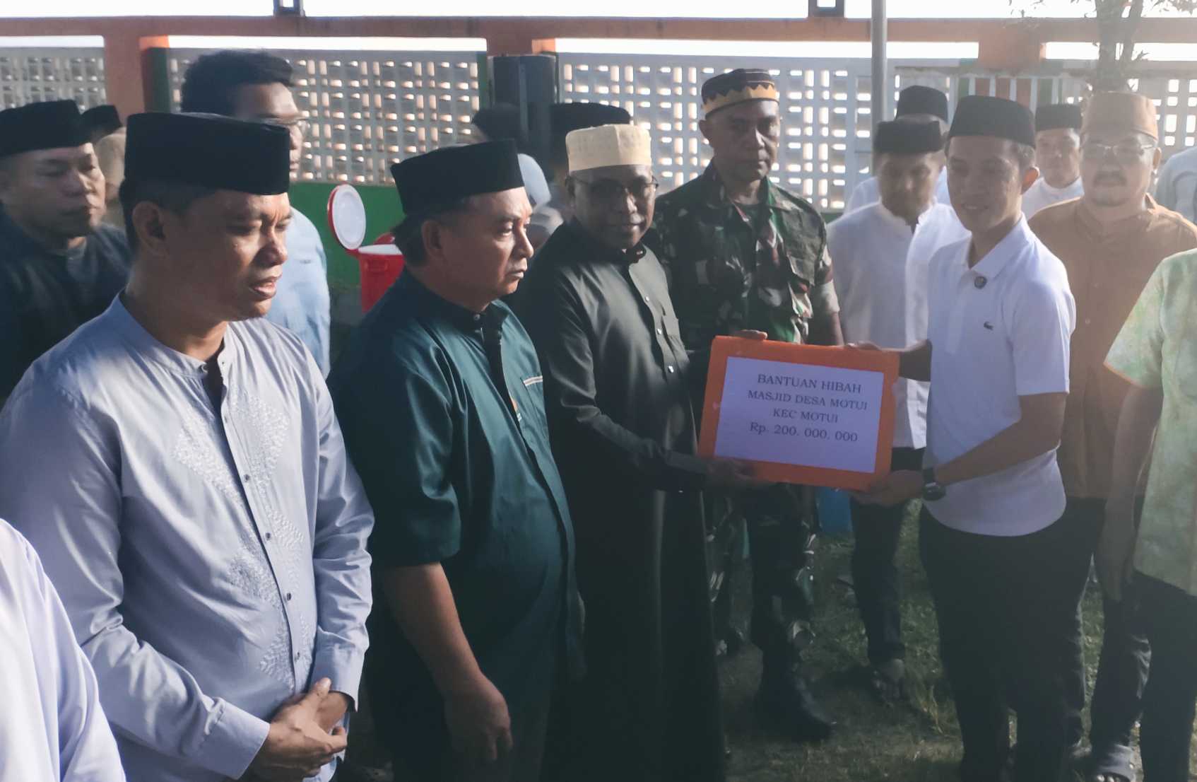 ” Hari ini kita bagikan Bantuan hibah masjid Desa Motui Rp.200 juta, Pondok pesantren Darul Amana Kelurahan Bende sejumlah Rp.50 juta kemudian ditambah Bantuan Hibah Masjid Desa Poni Poniki, Banggina, Tobimeita, Lambuluo, masing-masing Rp.25 Juta. Semoga bantuan hibah untuk masjid juga dapat di gunakan sebagaimana peruntukannya,” harap Bupati Konut H.Ikbar.