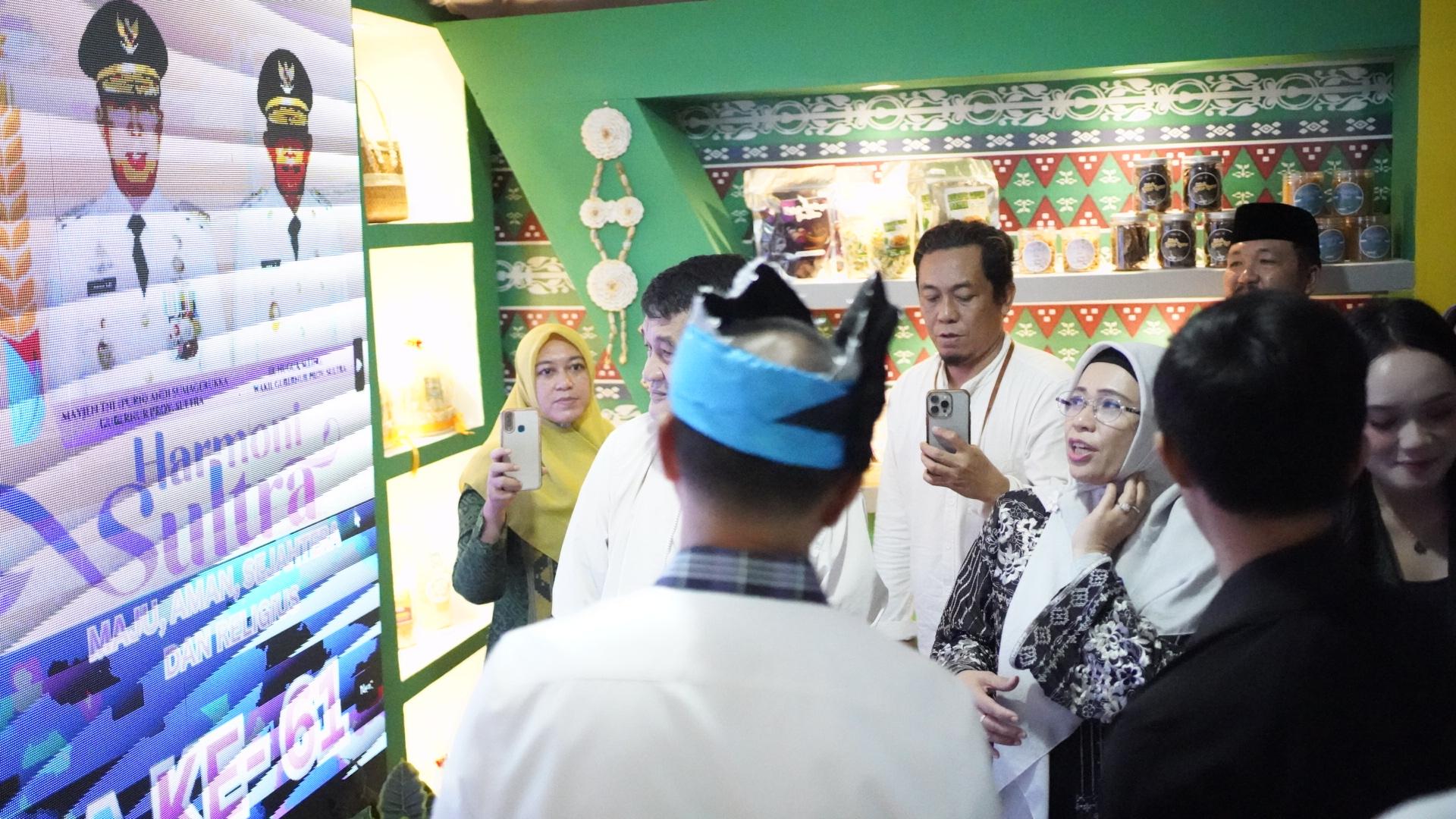 Gubernur Andi Sumangerukka dan Ketua DPRD La Ode Tariala nampak antusias saat mengunjungi stand pameran Pemda Konut, sambil melihat langsung promosi Desa Wisata Labengki dan produk industri rumah tangga khas Konut.
