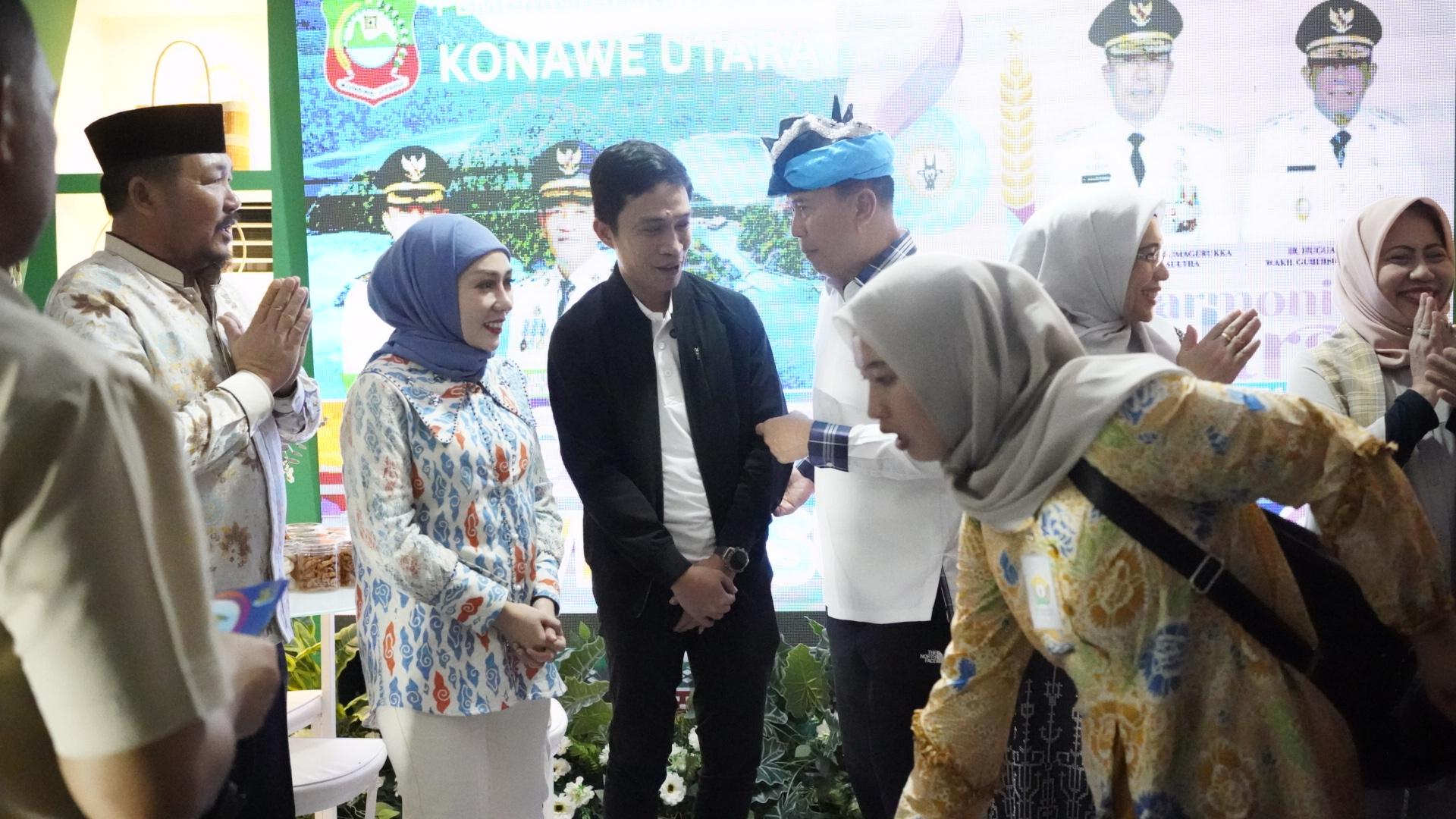 H Ikbar didampingi Wabup Abuhaera dan Ketua Dekranasda Konut juga memperkenalkan kain tenun kolasara dan produk industri rumah tangga khas Konawe Utara.