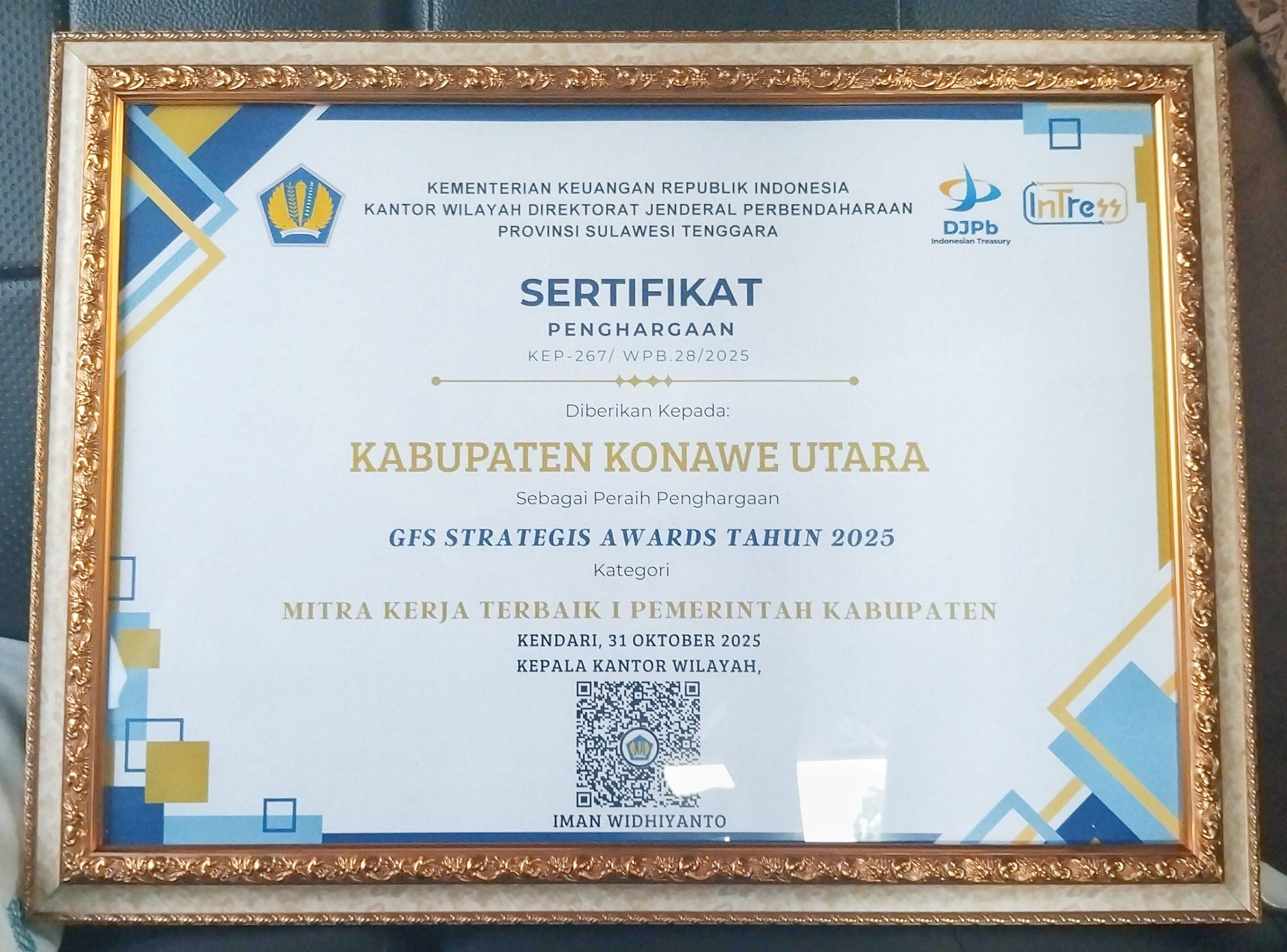 Untuk momen ini, Pemda Konawe Utara berhasil meraih Penghargaan GFS Strategis Awards Tahun 2025 kategori Mitra Kerja Terbaik I Pemerintah Kabupaten yang diserahkan langsung oleh Kantor Wilayah Direktorat Jenderal Perbendaharaan (DJPb) Provinsi Sulawesi Tenggara Kementerian Keuangan Republik Indonesia yang berlangsung di Aula Kantor Wilayah DJPb Sultra pada Jumat (07/11/2025).