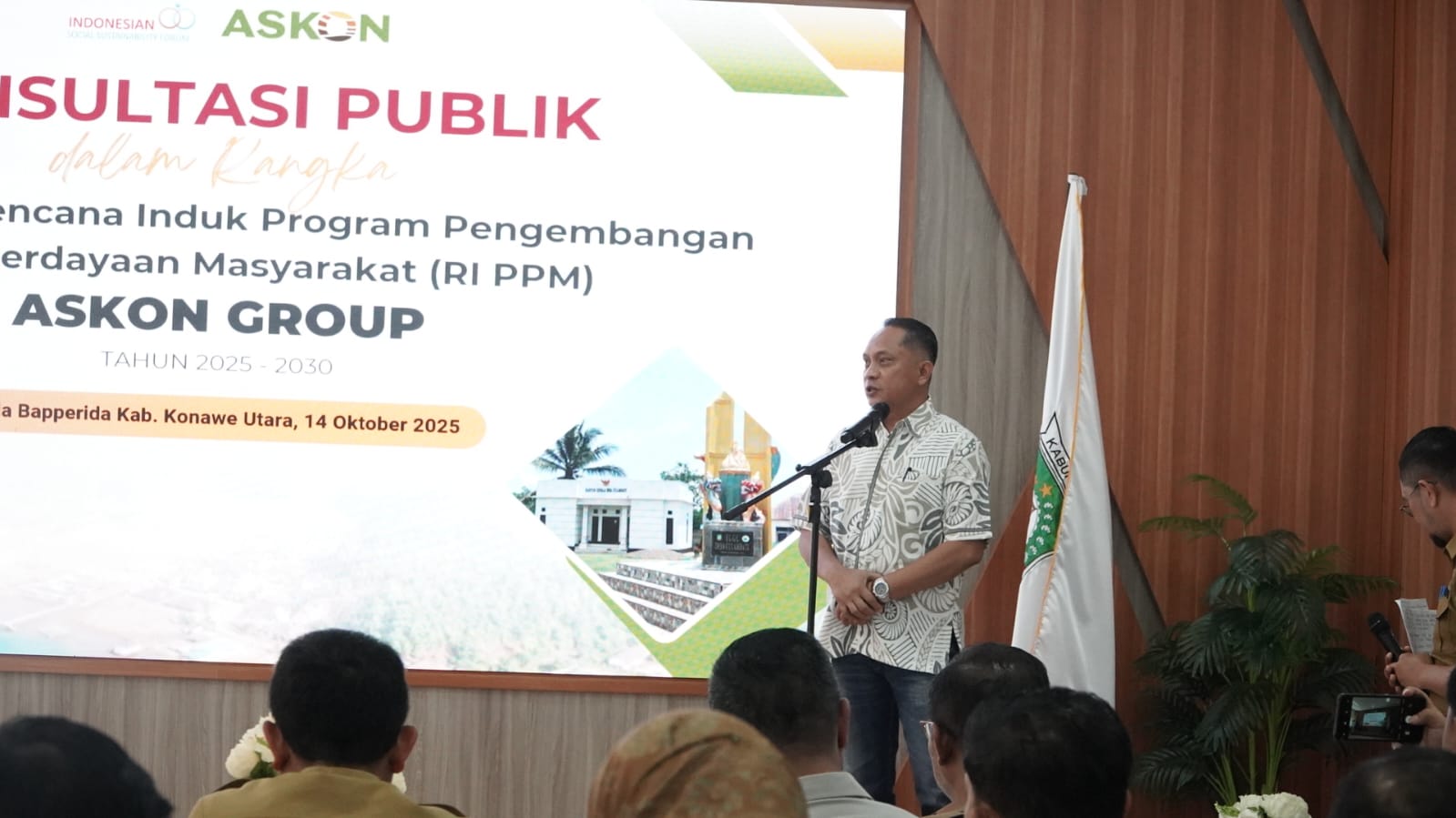 “Atas nama Pemerintah Kabupaten Konawe Utara, saya menyampaikan apresiasi kepada pihak Askon Group yang telah menginisiasi kegiatan konsultasi ini sebagai bagian dari penyusunan Rencana Induk Pengembangan dan Pemberdayaan Masyarakat (PPM),” ungkapnya.