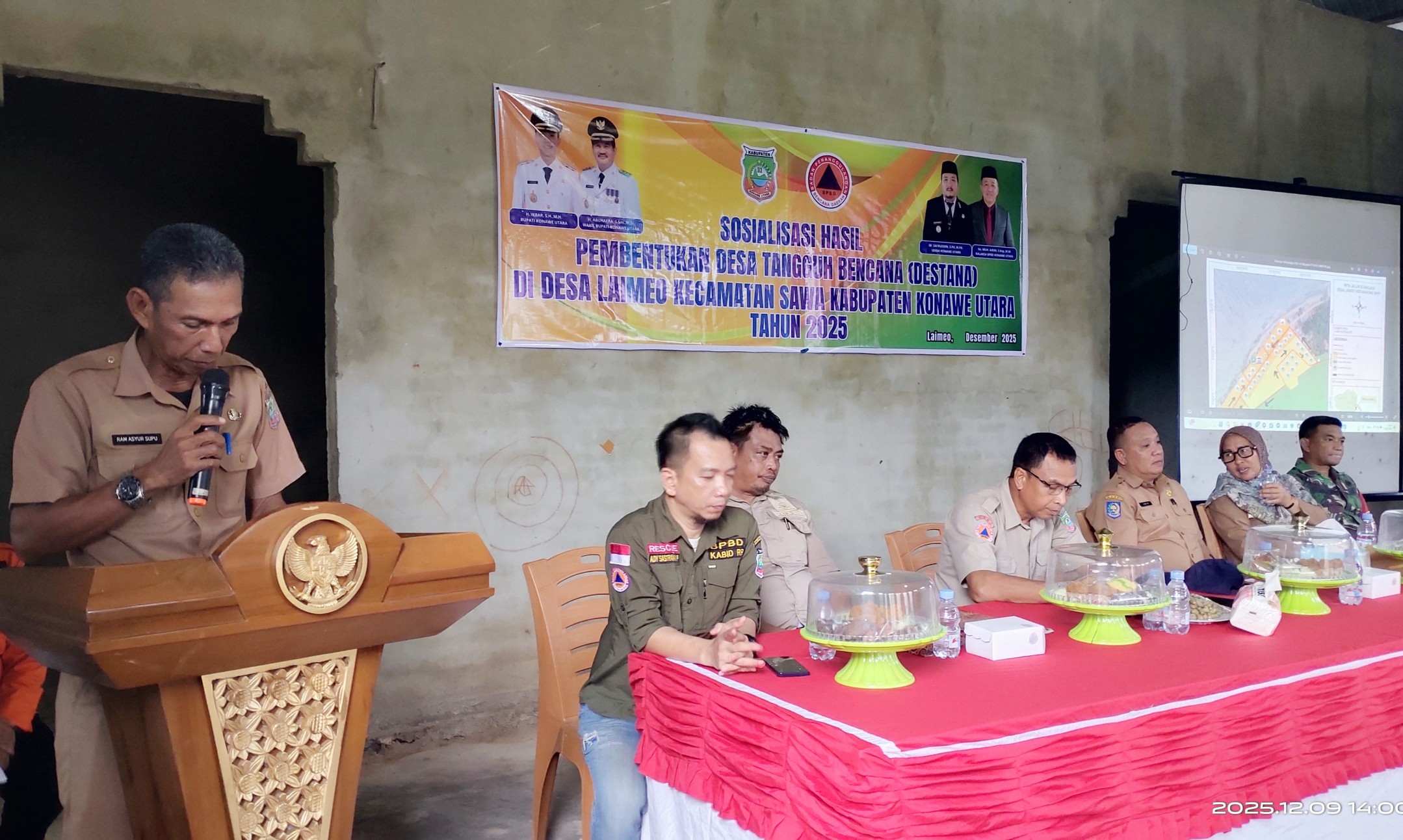 Kegiatan ini dibuka oleh Bupati Konawe Utara, H. Ikbar SH, MH melalui Staf ahli bupati bidang pemberdayaan masyarakat dan SDM, Ram Asyur Supu, SH bertempat di balai desa Laimeo pada Selasa (09/12/2025), kegiatan tersebut juga dihadiri oleh Sekretaris BPBD Konut bersama jajaran, Forkopimda, SAR Konawe Utara , Kepala BLUD RSUD Konut, Sekretaris Camat Sawa, Danramil Lasolo, Orari Lokal Konut, Kades Laimeo, Kelompok Kerja Destana Laimeo dan relawan Destana Desa Laimeo.