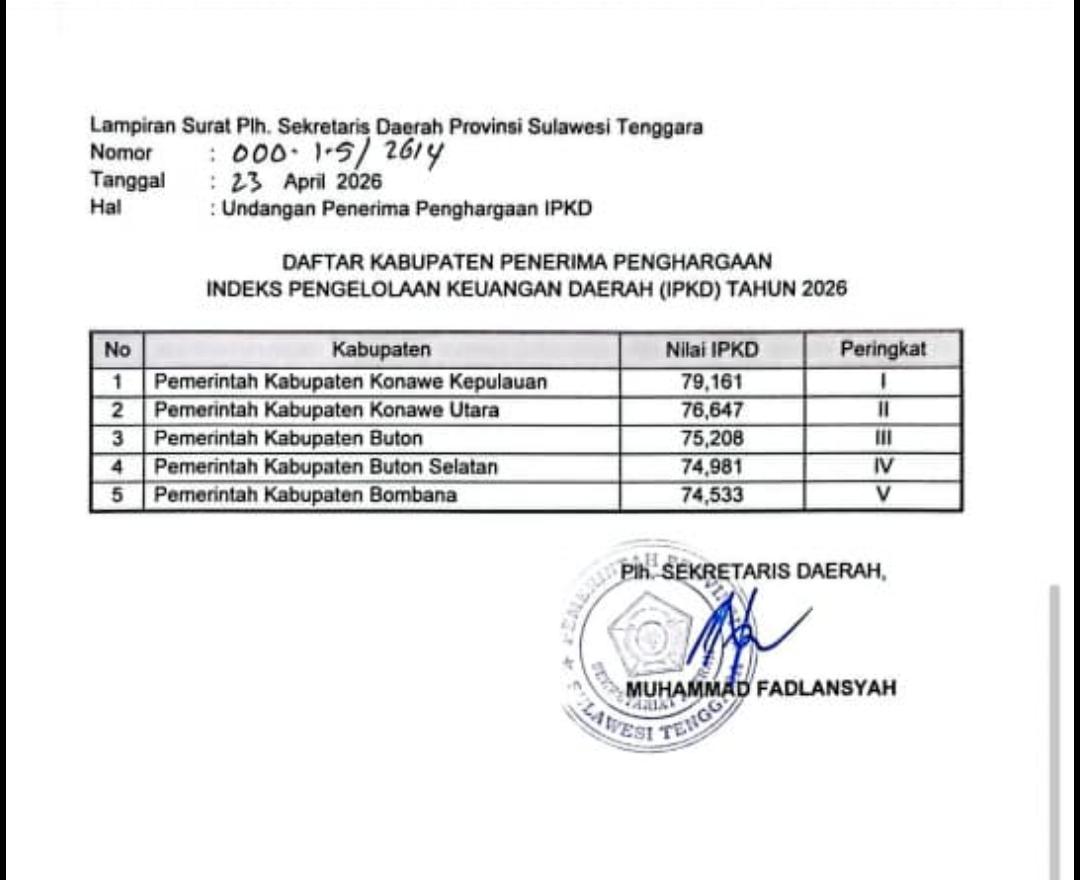 Untuk diketahui berdasarkan dokumen tersebut, Pemerintah Kabupaten Konawe Kepulauan berhasil menempati posisi pertama dengan nilai IPKD sebesar 79,161. Capaian ini menempatkan Konawe Kepulauan sebagai daerah dengan kinerja terbaik dalam pengelolaan keuangan daerah di Provinsi Sulawesi Tenggara tahun ini.