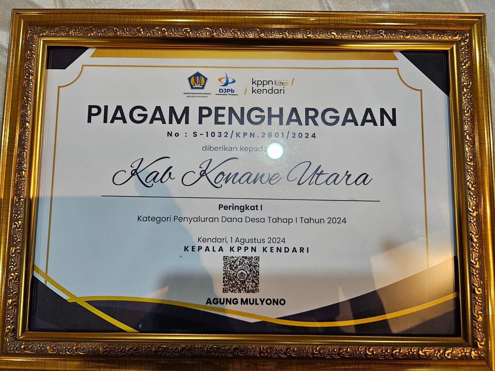 Hal itu dibuktikan dengan Piagam Penghargaan dari Kantor Wilayah Direktorat Jenderal Perbendaharaan Provinsi Sulawesi Tenggara yang diserahkan di Kota Kendari pada Selasa 06 Agustus 2024.