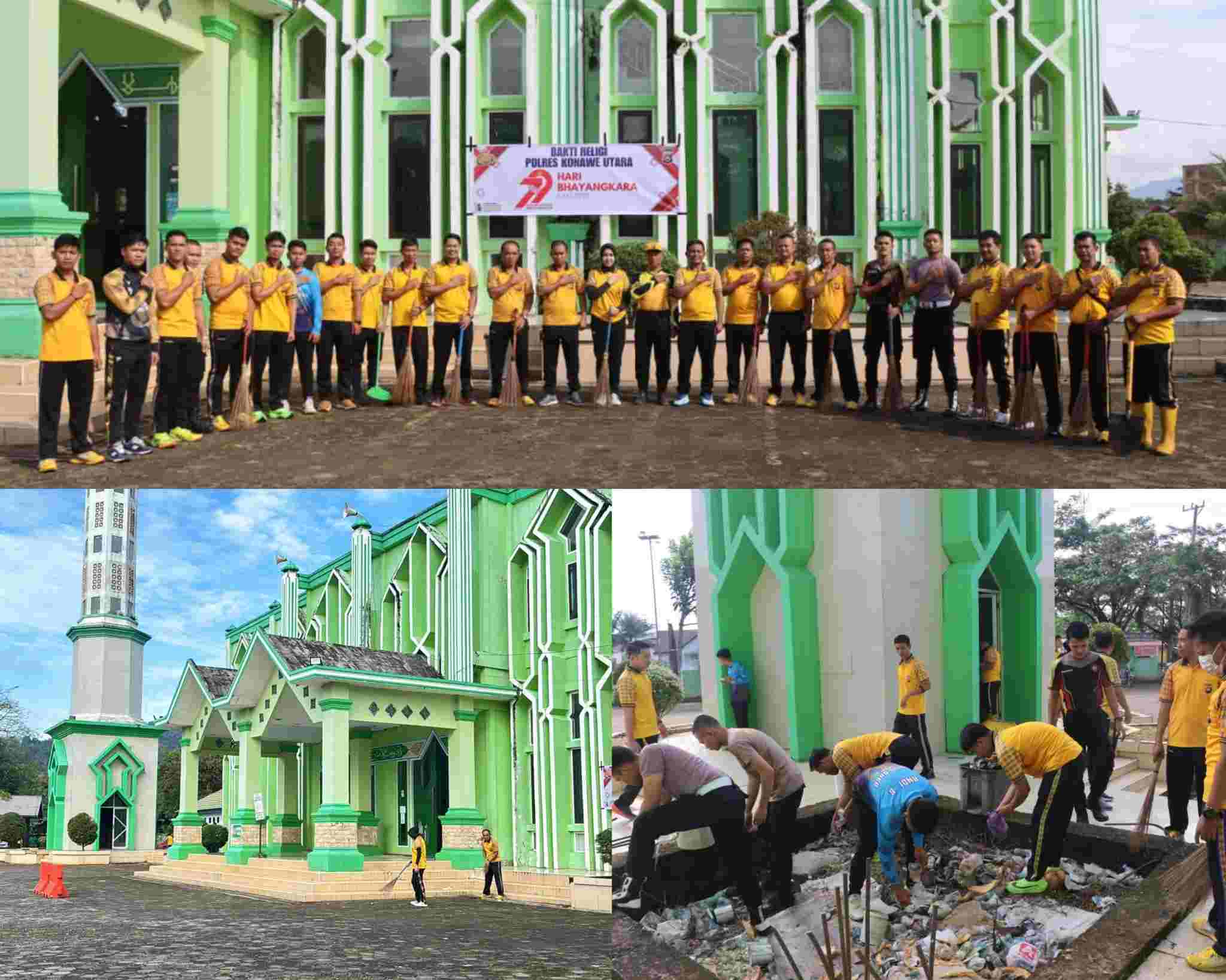 Secara bergotong royong Polres Konawe utara melaksanakan bersih-bersih halaman dan didalam mesjid baik dilakukan dengan menyapu, mencabut rumput, membakar sampah hingga merapikan fasilitas tempat ibadah.