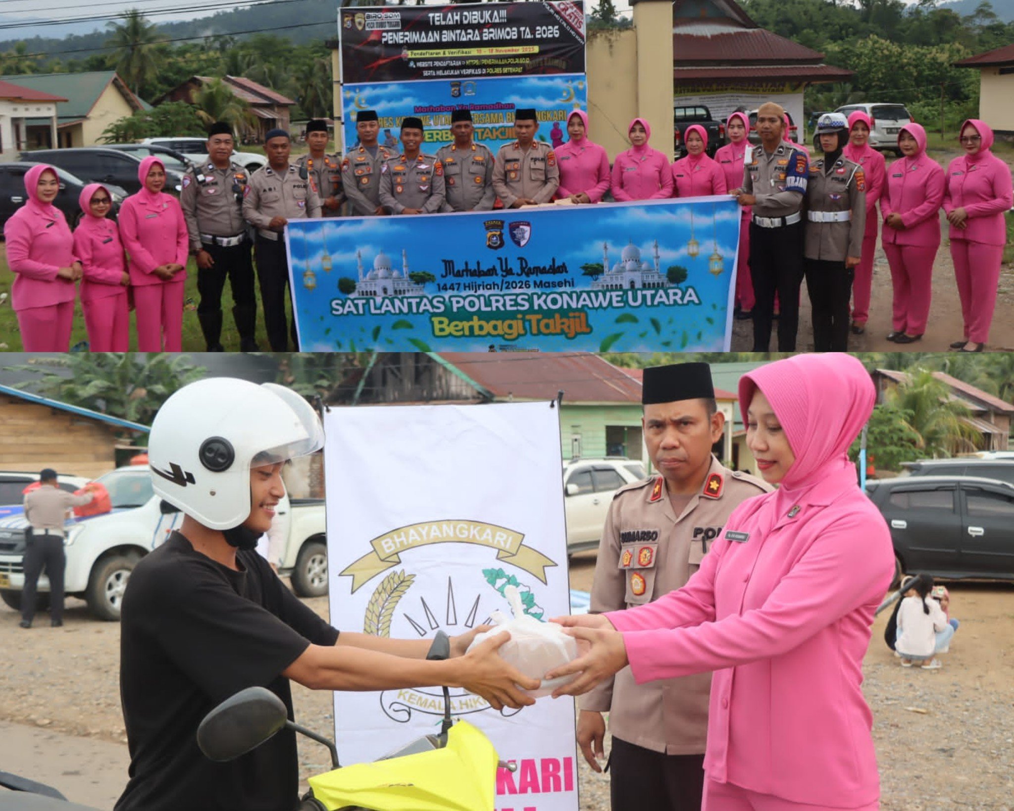 Anoapos.com | Konut – Dalam rangka berbagi berkah di bulan suci Ramadan, jajaran Polres Konawe Utara bersama pengurus Bhayangkari Cabang Konawe Utara melaksanakan kegiatan pembagian takjil dan Bhayangkari Peduli kepada masyarakat pada Sabtu (28/02/2026) sore.