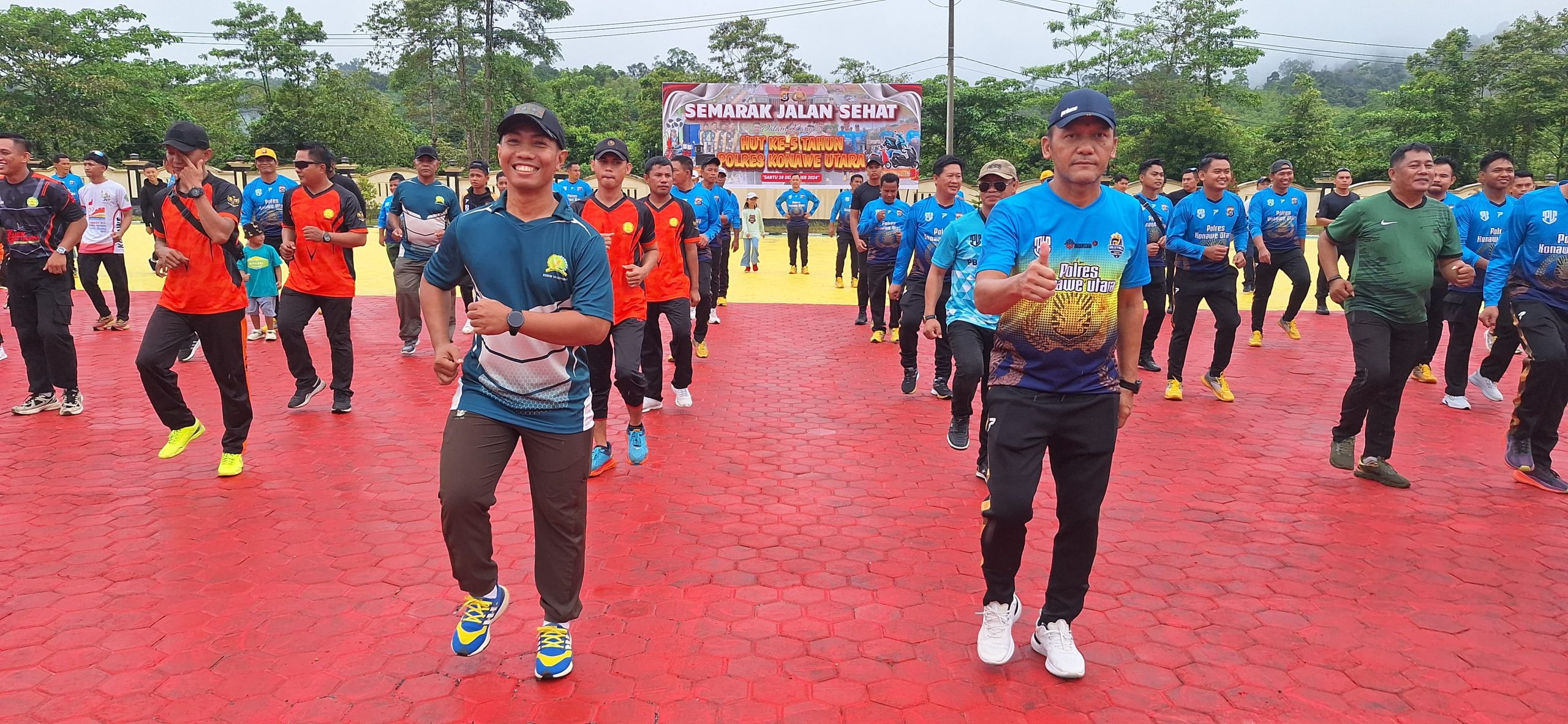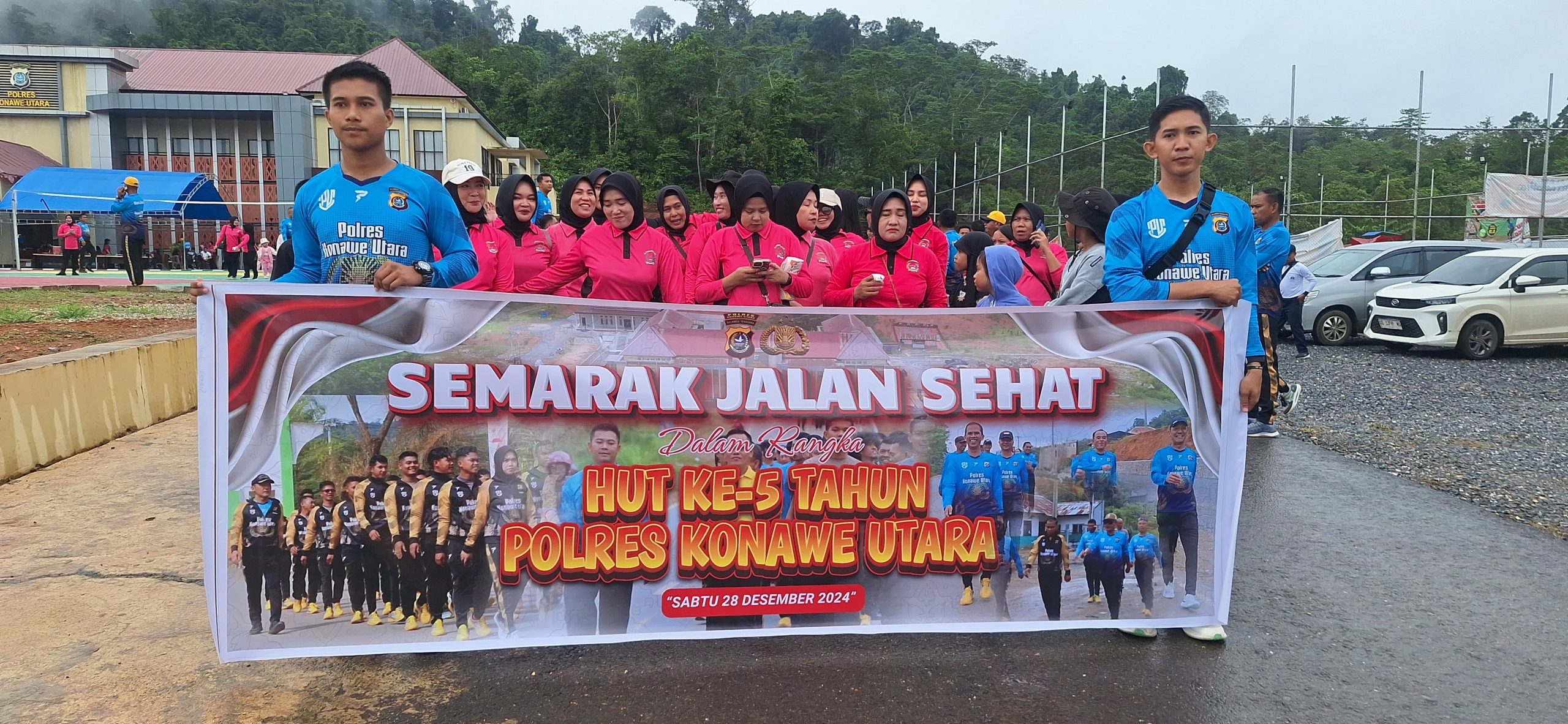 Anoapos.com | Konut – Memperingati Hari Ulang Tahun (HUT) Polres Kabupaten Konawe Utara (Konut) ke 5, Kepala Kepolisian Resort (Kapolres) Konut, AKBP Priyo Utomo SH.,S.I.K menggelar berbagai program kegiatan salah satunya jalan sehat.