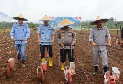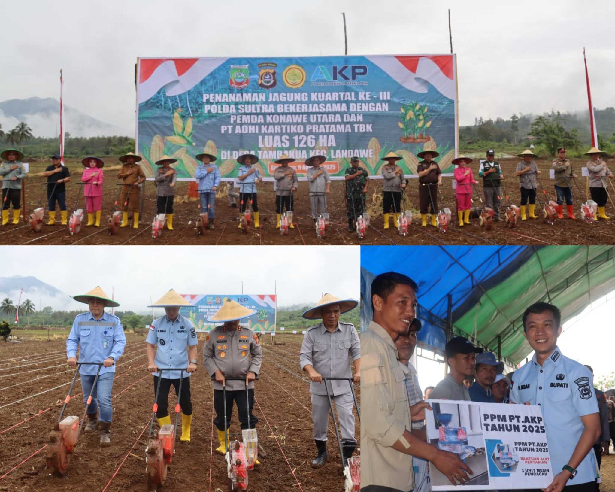 Kegiatan penanaman jagung tersebut turut dirangkaikan dengan penyerahan bantuan secara simbolis kepada kelompok tani. Bantuan yang diberikan meliputi mesin pengering jagung yang diserahkan oleh Kapolda Sultra, mesin pencacah jagung oleh Bupati Konawe Utara, dan alat tanam oleh manajemen PT Adhi Kartiko Pratama.
