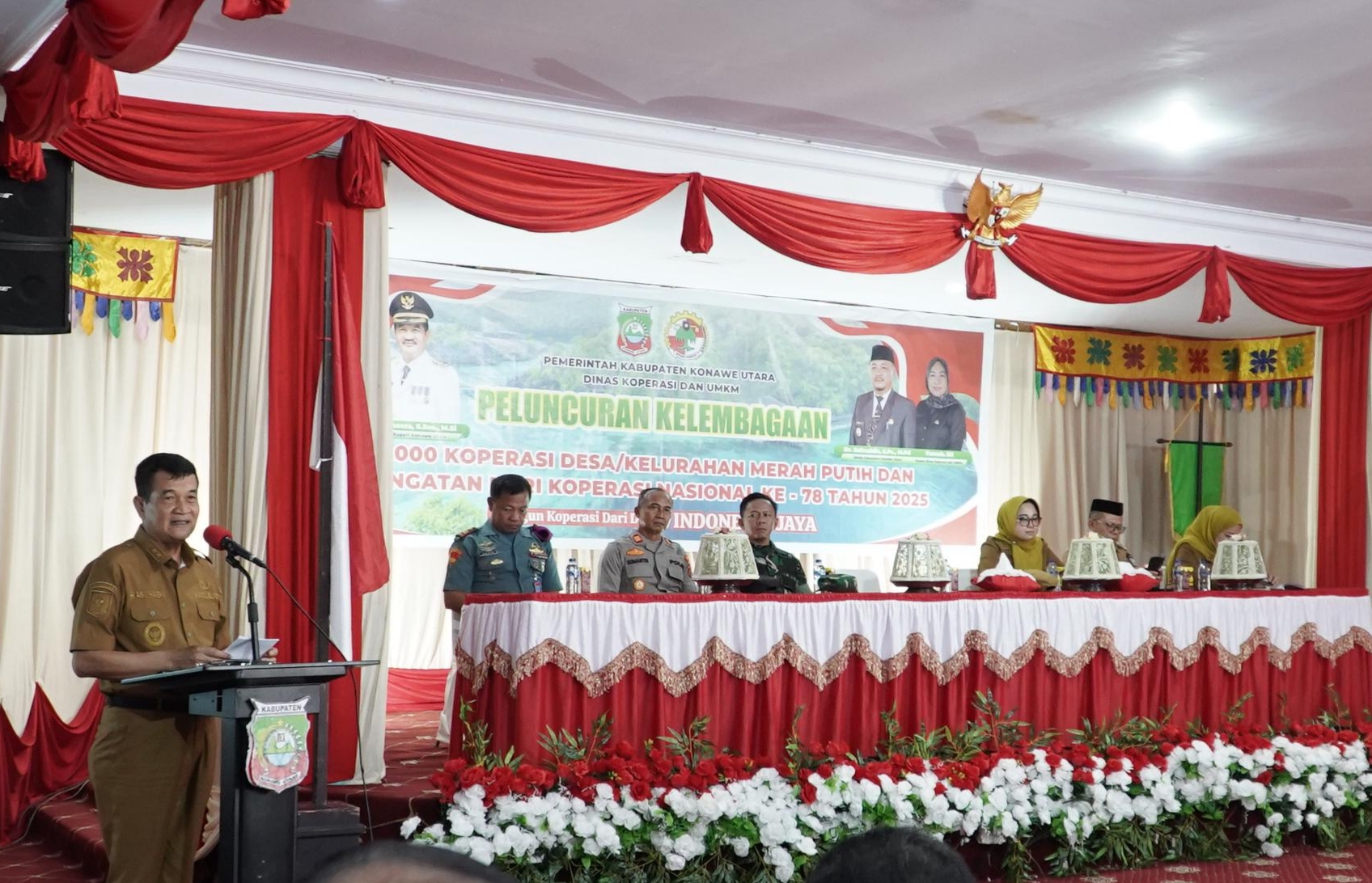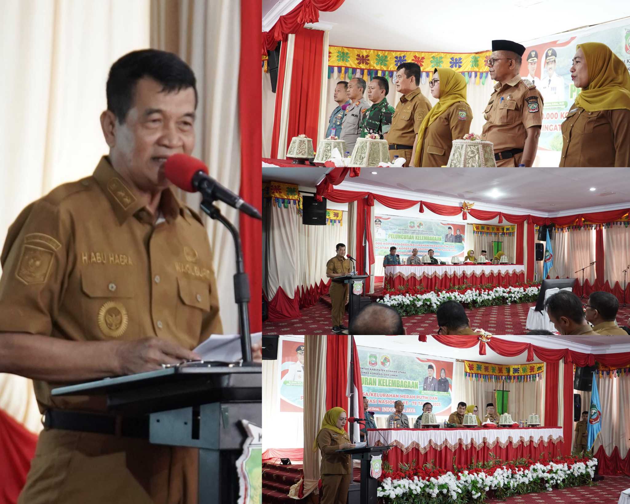 Anoapos.com | Konut – Wakil Bupati Konawe Utara (Konut) Provinsi Sulawesi Tenggara (Sultra) H.Abuhaera, S.Sos.,M.Si mewakili Bupati Konut, Ikbar, luncurkan kelembagaan Koperasi Desa dan Kelurahan Merah Putih tingkat Kabupaten Konawe Utara, di Aula Lantai 1 Kantor Bupati Konut pada Senin (21/07/2025).